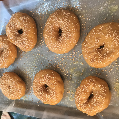 The Epicurious recipe breaks down into three big parts: making the dough (easy-peasy with a stand mixer); rolling out the bagels; and boiling and baking the bagels. Step one took less than 15 minutes of preparation, but extended out to an 75 minutes including time for the dough to rise; step two took less than 10 minutes of preparation, but extended out to 12 + hours to allow for overnight refrigeration; the third step took ~ 15 minutes of preparation (boiling the bagels and adding an egg wash & sesame) but extended to ~ 90 minutes including time for proofing prior to boiling and then the time for baking.